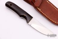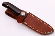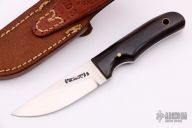 This Model 10 Salt Fisherman and Household Utility features a satin finish blade with notched thumb rest. 0.113" blade stock and 0.863" blade depth. The handle is comprised of black micarta scales over full tang construction. Brass lanyard tube with lanyard in pommel. Includes a brown leather sheath. Excellent condition.