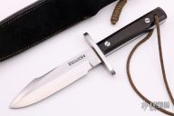 This Model 17 Astro by Randall features a satin finished spear point blade with false top edge, .222" blade stock. 1.317" blade depth, full tang construction. Black linen micarta scales, fastened with removable stainless steel bolts. A slot in the heavy tang and matching hollow inside the handle may be used to carry matches, fishhooks, line and other survival items. The Model 17 was especially designed for the seven Mercury astronauts, who carried them on America's first manned space flights. Astronaut Gordon Cooper did the final design, and two of these historically valuable knives are on display in the Smithsonian Institution. Includes black leather sheath with stone (sheath is stamped 5 6). Excellent condition.