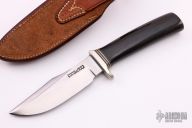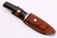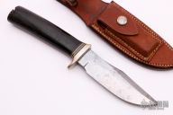 This Model 23 "Gamemaster" by Randall Made Knives features a satin finished clip point blade with sharpened top edge and a notched thumbrest, .187" blade stock and 1.284" blade depth hidden tang construction. The handle has a nickel silver guard and buffalo horn grip with white/black spacers. Comes with a brown leather sheath with stone. Has some scratches, some small cracks in the grip, at the butt there are two holes, may have been eaten by a bug or something, some patina on the blade, otherwise good user condition.
