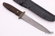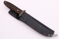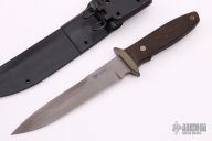This fighter by Bob Terzuola features a bead blasted blade with a sharpened top edge and notched thumbrest, .190" blade stock and 1.235" blade depth, hidden tang construction. The handle has a bead blasted titanium guard, black linen micarta grip with lanyard hole. Comes with a kydex sheath with belt loop. Has some scuffs and minor staining on the blade, otherwise good condition.