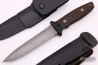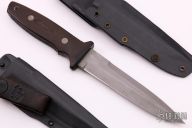 This fighter by Bob Terzuola features a bead blasted blade with a sharpened top edge and notched thumbrest, .185" blade stock and 1.133" blade depth, hidden tang construction. The handle has a black linen micarta grip with lanyard hole. Comes with 2 kydex sheaths. Has some scratches and minor staining on the blade, otherwise good condition.