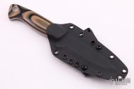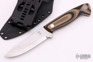 This XL Bushcrafter by Tom Krein features a satin finished blade with notched thumbrest, .125" blade stock and 1.088" blade depth. The handle is comprised of camo G-10 scales with a lanyard tube over full tang construction. Includes Kydex sheath with TekLok. Scuffs and scratches are visible on the blade otherwise the knife is in good condition.