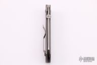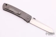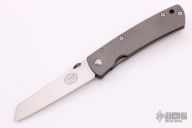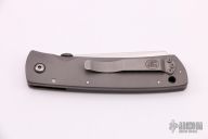 This knife by Bob Terzoula features a satin finished chisel ground blade with a thumbdisc. The handle has a bead blasted titanium frame and a blasted titanium liner, black backspacer, tip up stainless steel clip. Nice detent, lockup and blade seating. Has a few light scratches, otherwise excellent condition.
