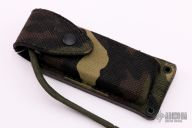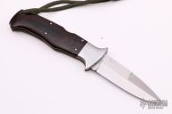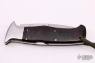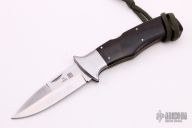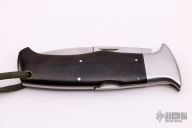 This 1980's Al Mar SERE features a satin finished spear point blade with a false top edge. The handle has satin finished stainless steel bolsters, brass liners, black/brown micarta scales, and a stainless steel backspacer. This is a nice heavy-duty folder. Includes a camo covered black leather sheath. Has some scratches and patina, otherwise good condition.