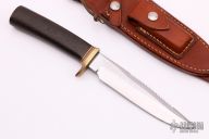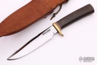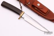 This Model 5-6 by Randall Made Knives features a satin finished blade with sharpened top edge and sawteeth, notched thumbrest, .222" blade stock and 1.169" blade depth, hidden tang construction. The handle has a brass guard, black linen micarta grip red/white/blue spacers. Comes with a brown leather sheath. Has been sharpened, has scratches, tip is blunted, good user condition otherwise.