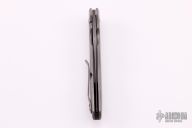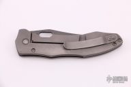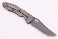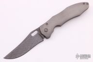 LR.6 aka the "English" is Ed's custom knife design! This knife is a beauty that will capture your eye every time you pull it out but it is a tool meant for the hard use cutting tasks. It features a 3.75" recurve clip point blade made from Vegas Forge Raindrop Damascus with a dark acid etched finish. The thumb slot opening method cannot be used for flicking the blade out, this is more of a slide open type of folder, hearkening back to a time before bearings and flipper tabs. The handle is contoured titanium with a matte bead blasted finish. This knife is ergonomic, tactical, utilitarian, and most of all beautiful. Ed has an amazing knife, and we think it's indeed up there with the best tactical/EDC knives in the business. Comes with a zippered case. Has some scuffs/scratches on the frame, otherwise good condition.