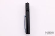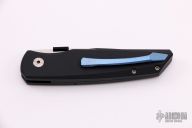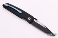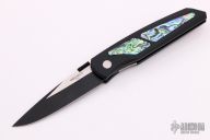 This Harkins D/A Auto linerlock folder has a two-tone stainless steel drop point blade with swedge and thumbdisc. Handle is black anodized aluminum with abalone inserts and anodized titanium tip up clip with hidden screws and orange peel finish. Excellent Condition. Comes with original box and papers.