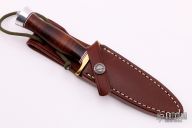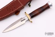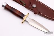 This Model 2-4 features a satin finished double-edged blade, .171" blade stock and .900" blade depth, hidden tang construction. The handle has brass guard, stacked leather handle with red/white/blue spacers, and a duralumin butt cap. Comes with brown leather sheath. Has some light scratches, otherwise excellent condition.
