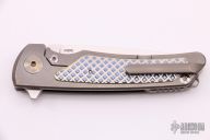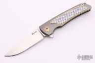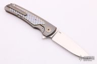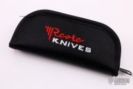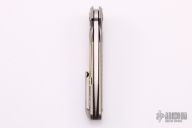 The Wave flipper from Reate Knives features a stonewashed blade with notched flipper. The handle has a stonewashed titanium frame with matching backspacer and tip up clip with hidden screws, milled anodized titanium inlays. Comes with a zippered case. Excellent condition.