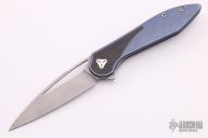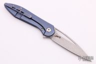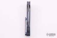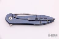 This Aero Mini from Boos Blades, features a tumbled blade with an elongated thumbhole, notched thumbrest and flipper. The handle is composed of tumbled anodized titanium scales with carbon fiber inlay, a matching tip up clip and backspacer. Has been used and carried, has scuffs and scratches, otherwise good condition. Nice detent, lockup and blade seating.