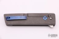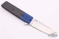 This Left Handed Kwaiken by David Clark features a satin finished tanto blade with notched thumbrest and flipper. The handle has a blue twill bolster, silver lightning strike carbon fiber scale, tumble finished titanium frame, carbon fiber backspacer and tip up anodized titanium clip. Nice detent, lockup and blade seating. Comes with nylon velcro case. Has some scratches on the clip, some light scratches on the blade, otherwise good condition.