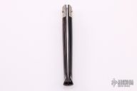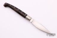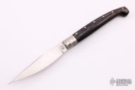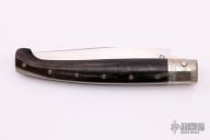 This Pattada by Giampiero Pizzadili features a satin finished blade. The handle has engraved nickel silver bolsters, buffalo horn covers with a stainless steel spring. Has some light scratches and the tip of the blade is a little bent, otherwise excellent condition. Comes with a zippered case.