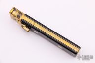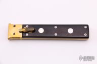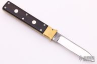 This Gravity Knife by Pabu features a polished drop point blade made from a file. The handle has brass bolsters, brass frame, dark wood scales with mother-of-pearl inlays. Nice function. Comes with a zippered case. Has some patina on the brass, otherwise excellent condition.
