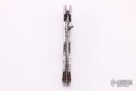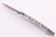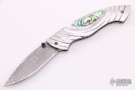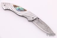 This knife features a Damascus blade with fileworked spine and single thumbstud. The handle has  carved and polished stainless steel scales with mother-of-pearl and abalone inlays, fileworked stainless steel liners and backspacer. Has a few light scratches, otherwise excellent condition.