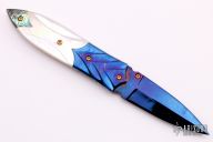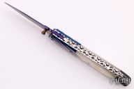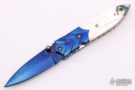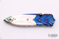 This knife features a Damascus blade with false top edge and single brass thumbstud with yellow stone inlay. The handle has  carved blued Damascus bolsters, mother-of-pearl scales with abalone butt, fileworked stainless steel liners and backspacer. Has a few light scratches, otherwise excellent condition.