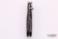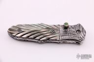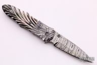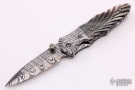 This knife features a Damascus blade with a single thumbstud with green stone inlay. The handle has carved Damascus bolsters, carved black lip pearl scales, fileworked stainless steel liners and backspacer with abalone inlays. Has a few light scratches, otherwise excellent condition.