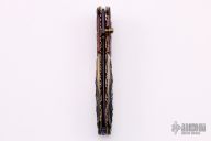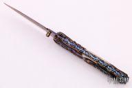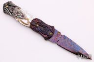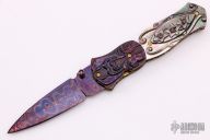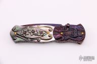 This knife features a Blued Damascus blade with a single thumbstud with purple stone inlay. The handle has carved and colored bolsters, carved black lip pearl scales with purple stone inlays, fileworked and anodized titanium liners and backspacer. Gold-plated screws. Has a few light scratches, otherwise excellent condition.