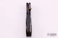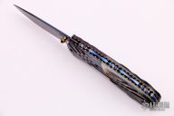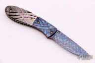 This knife features a Blued Damascus blade with a single thumbstud with black lip pearl inlay. The handle has carved and blued Damascus bolsters, carved black lip pearl scales, fileworked and anodized titanium liners and backspacer. Gold-plated screws. Has a few light scratches, otherwise excellent condition.