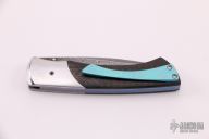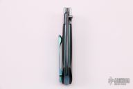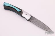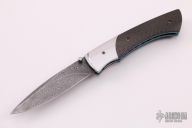 This Sparrow Hawk folder from William Tuch features a flat ground, Thomas Raindrop stainless steel Damascus blade with a single anodized thumbstud. The handle features carbon fiber scales with hand carved/polished stainless steel bolsters. The titanium liners, backspacer, and pocket clip have all been hand stippled/jeweled and anodized. Blade is centered when closed. Opens smoothly and locks up with no play. Comes with COA dated August 2016. Has been used and carried, has scuffs and scratches, otherwise good condition.