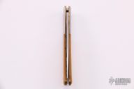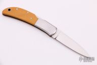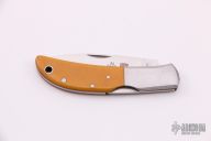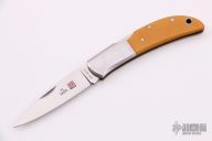This knife by Al Mar features a satin finished blade with nail nick. The handle has stainless steel bolsters, yellow paper micarta scales, brass liners, and a stainless steel backspacer. Has been used and carried, has scuffs and scratches, has been resharpened, otherwise good user condition.