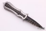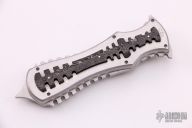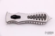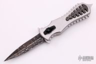 This Burn Razor OTF has a Damascus hollow ground, double-edged spear point blade.  The handle features a stainless steel construction with Damascus overlays.   Blade deploys with authority and locks up tight with minimal blade play. Light spotting is visible on the handle otherwise the knife is in excellent condition.