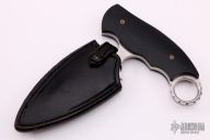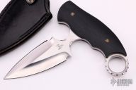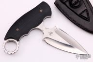 This Push Dagger by Burn Knives features a satin finished double-edged blade.  .262" Blade Stock.  1.66" Blade Depth.  The handle features a full tang construction, micarta scales, mosaic pins and a file worked ring.  Includes a black leather sheath.  Light scuffs are visible on te handle otherwise the knife is in good condition.