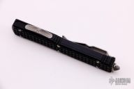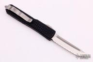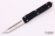 This Ultratech OTF automatic by Microtech knives features a stonewashed tanto blade with serrations, and a frag pattern black aluminum handle with steel hardware, tip down carry. Glass breaker. S/N 57762. Dated 07/2015. Excellent Condition.
