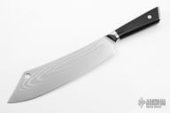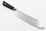 This Chef/Butcher Kitchen knife features 67-Layer VG-10 core San Mai Damascus blades with integral guard, black G-10 scales with a single mosaic pin and a mirror polished stainless steel butt, .086" blade stock and 2.338" blade depth, integral hidden tang construction. Comes with original box. New from maker. These knives are razor sharp and very thin at the edge creating a beautiful kitchen knife. I personally bought and tested one of these before committing to putting them on the site, THEY ARE FANTASTIC AND YOU CAN'T BEAT THE PRICE.