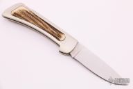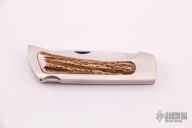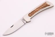 This is a Lockback Folder features a satin finished blade with nail nick. The handle has a nickel silver frame with stag inlays and stainless steel spring and backspacer. Nice blade seating and lockup. Has some light scratches, otherwise excellent condition.
