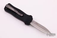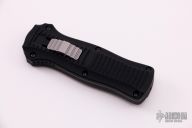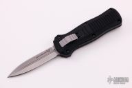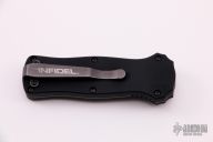 This 3350 Mini-Infidel by Benchmade features a bead blasted, double edge dagger style D2 blade with fullers. The handle is comprised of a black anodized aluminum frame, ramped steel thumb slide and steel tip down clip. Includes original box, nylon sheath and paperwork. Excellent Condition.