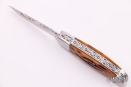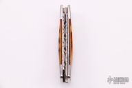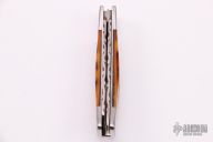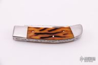 This trapper by Don Robinson features hand rub satin finished blades with nail nicks and fileworked spines. The handle has stainless steel bolsters, jigged bone covers, stainless steel liners and springs with fileworked spines. Has half-stops, flush in all positions. Comes with a zippered case. Has some light scratches, otherwise excellent condition.