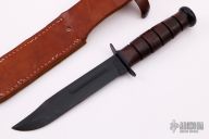This KA-BAR USMC Fighting Knife has a carbon steel black clip point blade, marked "KA-BAR/ Olean, N.Y. USMC", and steel double guard. Blade stock is .174", depth 1.233". Handle is stacked leather with a 3/8" pinned butt cap. Minor scuffs and scratches on blade, otherwise excellent condition. Includes leather sheath with belt loop.