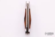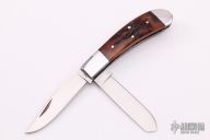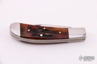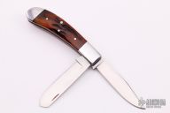 This trapper by Don Robinson features hand rub satin finished blades with nail nicks. The handle has stainless steel bolsters, jigged bone covers, stainless steel and brass liners and stainless steel springs. Has half-stops, flush in all positions. Comes with a zippered case. Has some light scratches, otherwise excellent condition.
