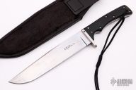 This knife by Don Robinson features a clip point satin finished blade with .248" blade stock and 1.742" blade depth, full tang construction. The handle has a stainless steel guard and black linen micarta scales. Has some light scratches, otherwise excellent condition. Comes with a black leather sheath.