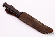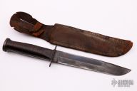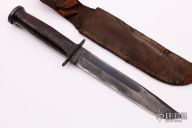This WWII fighter by Western Cutlery features a blued blade with fullers and sharpened top edge, .176" blade stock and 1.263" blade depth, full tang construction. The handle has a steel guard and butt, stacked leather scales with red/black spacers. Comes with brown leather sheath, sheath is in rough shape. Has some scratches and dings in the edge, good condition for its age.