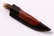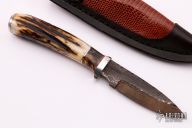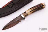 This Hunter by Herb Derr features a Random Pattern Damascus blade with file worked spine. .151" blade depth and .945" blade depth, hidden tang construction. The handle is comprised of a nickel silver guard and pommel with buckeye burl and nickel silver spacer and a stag grip. Includes a brown leather sheath with lizard skin inlay. New from maker.