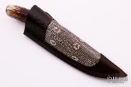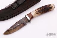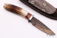 This Hunter by Herb Derr features a Birds Eye Pattern Damascus blade with file worked spine. .159" blade depth and 1.119" blade depth, hidden tang construction. The handle is comprised of a nickel silver guard and pommel with maple burl and nickel silver spacer and a stag grip. Includes a brown leather sheath with lizard skin inlay. New from maker.