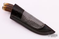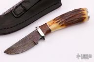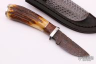 This Skinner by Herb Derr features a Fogs Hair Pattern Damascus blade with file worked spine. .141" blade depth and 1.089" blade depth, hidden tang construction. The handle is comprised of a nickel silver guard and pommel with maple burl and nickel silver spacer and a stag grip. Includes a brown leather sheath with snake skin inlay. New from maker.