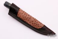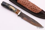 This Hunter by Herb Derr features a Birds Eye Pattern Damascus blade with file worked spine. .170" blade depth and 1.179" blade depth, hidden tang construction. The handle is comprised of a nickel silver guard and pommel with maple burl and nickel silver spacer and a zebra leg bone grip. Includes a brown leather sheath with ostrich leg skin inlay. New from maker.