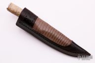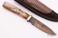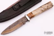This Hunter by Herb Derr features a Birds Eye Pattern Damascus blade with file worked spine. .161" blade depth and 1.018" blade depth, hidden tang construction. The handle is comprised of a nickel silver guard and pommel with buckeye and nickel silver spacer and a walrus jaw bone grip. Includes a brown leather sheath with lizard skin inlay. New from maker.