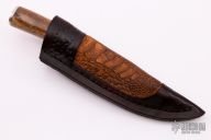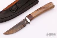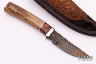 This Skinner by Herb Derr features a Birds Eye Pattern Damascus blade with file worked spine. .162" blade depth and .919" blade depth, hidden tang construction. The handle is comprised of a nickel silver guard and pommel with buckeye burl and nickel silver spacer and an Oosic grip. Includes a brown leather sheath with ostrich leg skin inlay. New from maker.