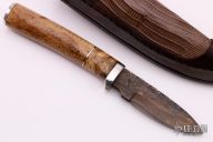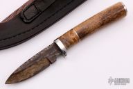 This Skinner by Herb Derr features a Birds Eye Pattern Damascus blade with file worked spine. .165" blade depth and .906" blade depth, hidden tang construction. The handle is comprised of a nickel silver guard and pommel with maple burl and nickel silver spacer and an Oosic grip. Includes a brown leather sheath with lizard skin inlay. New from maker.