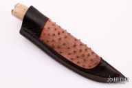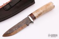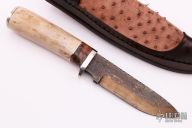 This Hunter by Herb Derr features a Birds Eye Pattern Damascus blade with file worked spine. .175" blade depth and 1.206" blade depth, hidden tang construction. The handle is comprised of a nickel silver guard and pommel with spalted maple and nickel silver spacer and an Oosic grip. Includes a brown leather sheath with ostrich leg skin inlay. New from maker.