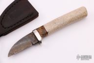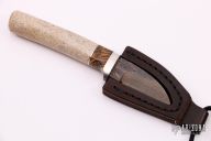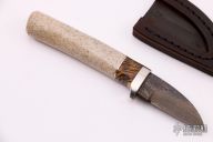 This Neck Knife by Herb Derr features a Birds Eye Pattern Damascus blade, .141" blade depth and .775" blade depth, hidden tang construction. The handle is comprised of a nickel silver guard with maple burl and nickel silver spacer and an Oosic grip. Includes a brown leather magnetic sheath. New from maker.