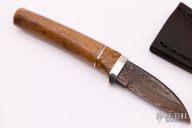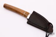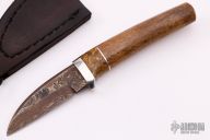 This Neck Knife by Herb Derr features a Birds Eye Pattern Damascus blade, .139" blade depth and .804" blade depth, hidden tang construction. The handle is comprised of a nickel silver guard with maple burl and nickel silver spacer and an Oosic grip. Includes a brown leather magnetic sheath. New from maker.