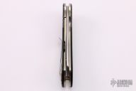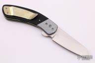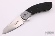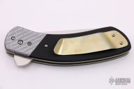 This Linerlock folder from Don Robinson features a satin finished drop point blade with flipper tab. The handle is comprised of silver twill carbon fiber bolsters, black synthetic scales, anodized titanium liners and clip positioned for tip up carry. No automatic machinery was used in making this knife, it was made by hand using hand operated machinery. Includes a padded zippered case. Light scratches are visible on the blade otherwise the knife is in excellent condition.