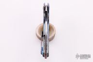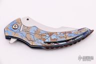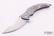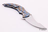This custom 7x flipper Prototype by Sergey Rogovets features a satin finished upswept blade with flipper . The handle has a carved and anodized titanium frame with orange peel finish, floating MokuTi backspacer with jimping, and a tip up titanium clip that matches the frame. Nice detent, lockup and blade seating. Comes with original box and COA dated April 2016. Excellent condition. #1612