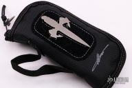 This Custom Combat Troodon Interceptor by Marfione Custom Knives features a two-tone stonewashed blade with sawteeth on the blade spine and a sharpened top edge. The handle is hand sculpted black aluminum with blue ringed titanium hardware, and a black stainless steel pocket clip. The clip is marked "A. Marfione" and dated 10/2017 and dagger logo is on the clip. Comes with a nylon zippered case and original box and papers. Excellent condition.