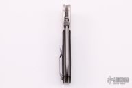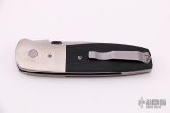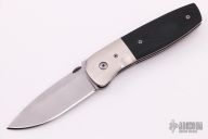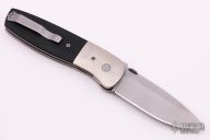 This Bobcat Linerlock by Marty Young features a tumble finished blade with thumbdisc and notched thumbrest. The handle has orange peel finished titanium bolsters, backspacer and liners, black G-10 scales, tip up tumbled stainless steel clip. Nice detent, lockup and blade seating. Has a couple light scratches on the bolsters, otherwise excellent condition. Razor sharp (why don't all knives come from the makers like this?)