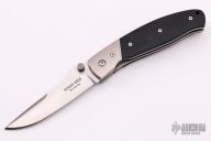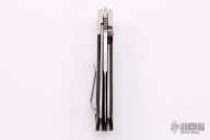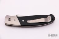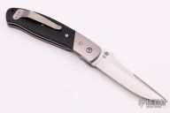 This T1-M4 by Roger Dole features a satin finished blade with false top edge and single checkered thumb stud, notched thumbrest. The handle has titanium bolsters, black G-10 scales over titanium liners and a black G-10 backspacer, tip up titanium clip. Marked 007. Has some light scratches, otherwise excellent condition.